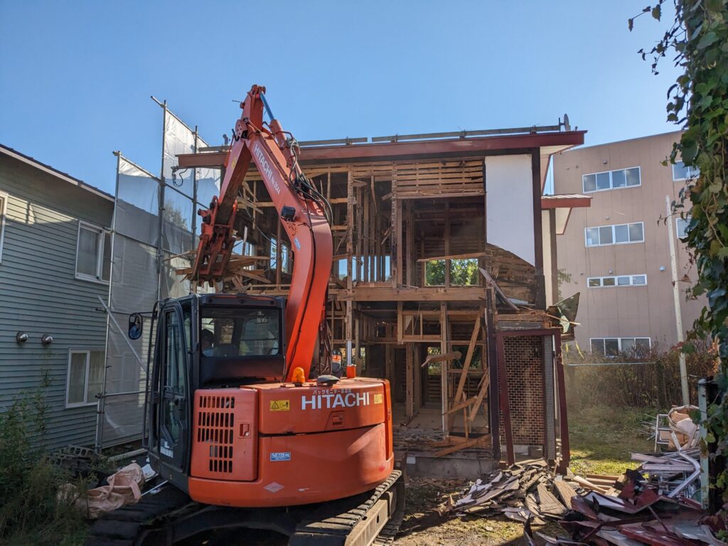 近隣に建物があったので、自社で足場を組み、内装は全て手作業で行いました。それにより分別・リサイクルを適切に行うことができます。